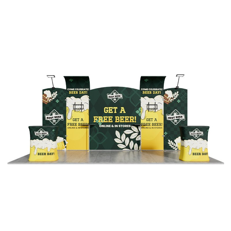 The 10x20ft Trade Show Booth Kit – 10 is a versatile modular exhibit solution designed to maximize brand visibility while offering flexibility for different event needs. Featuring a combination of arch-top banners, inverted J-shaped stands, counters, modular tables, and LED lighting, this kit creates a professional and visually striking booth environment. The open design makes it ideal for attracting attention, encouraging interaction, and showcasing your products or services in style.