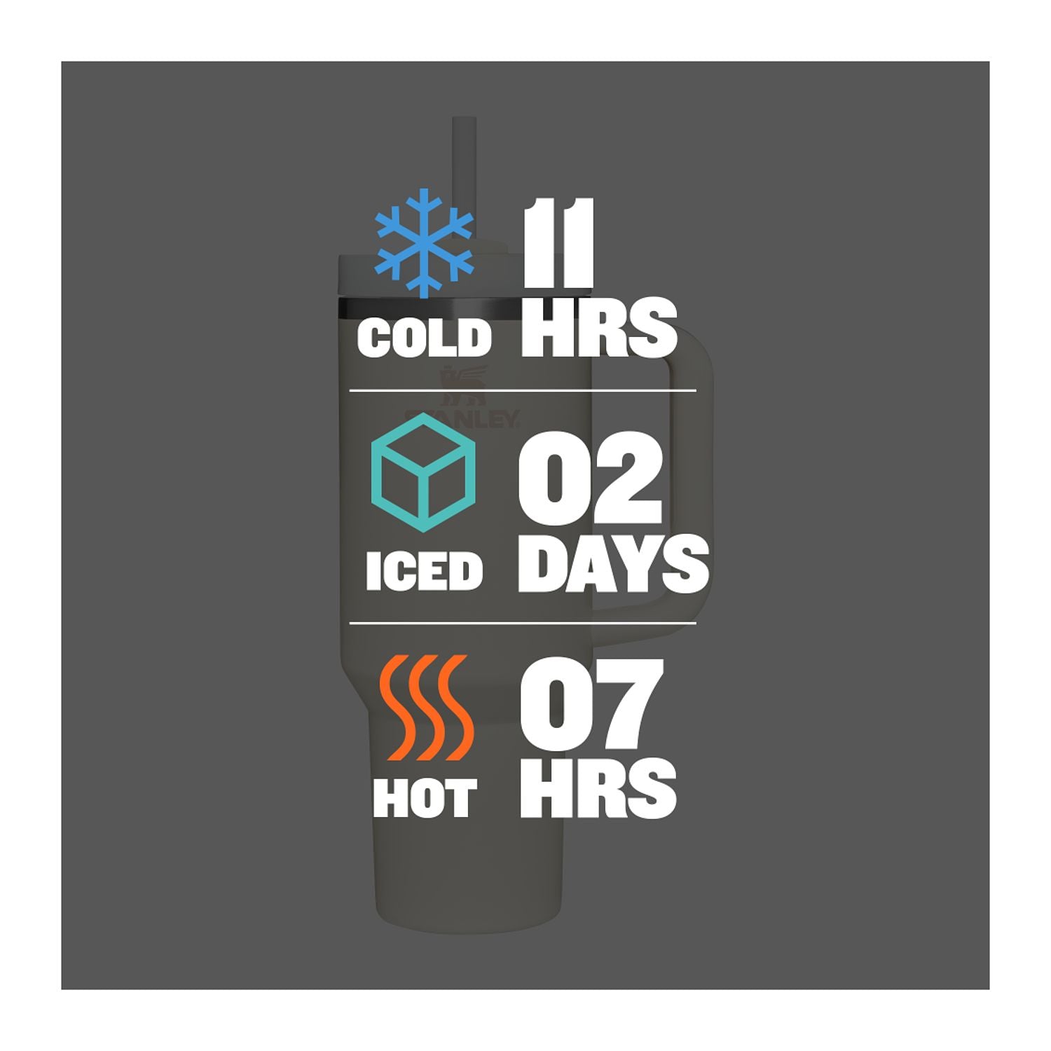 Double-wall vacuum insulation: 11 hrs cold / 2 days iced