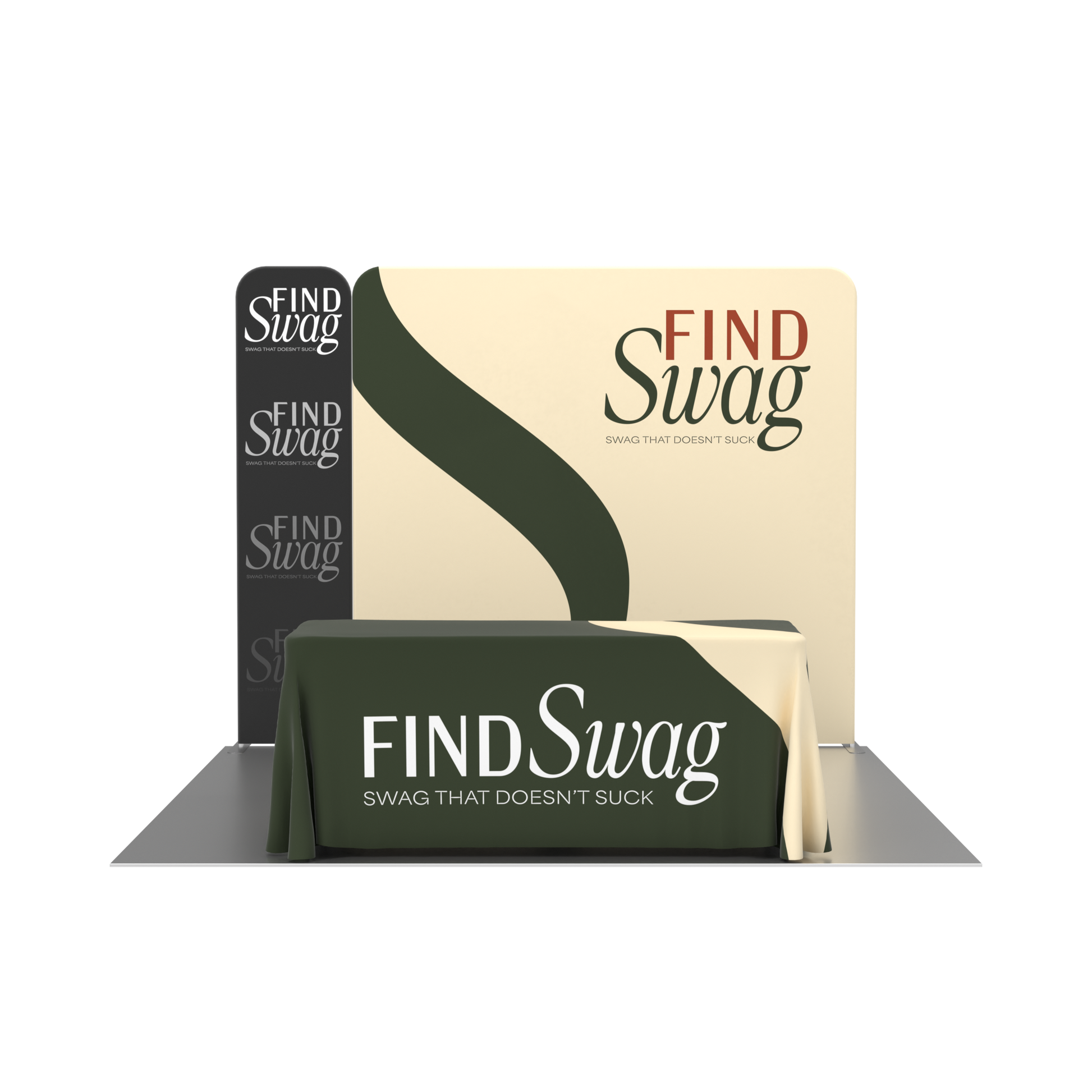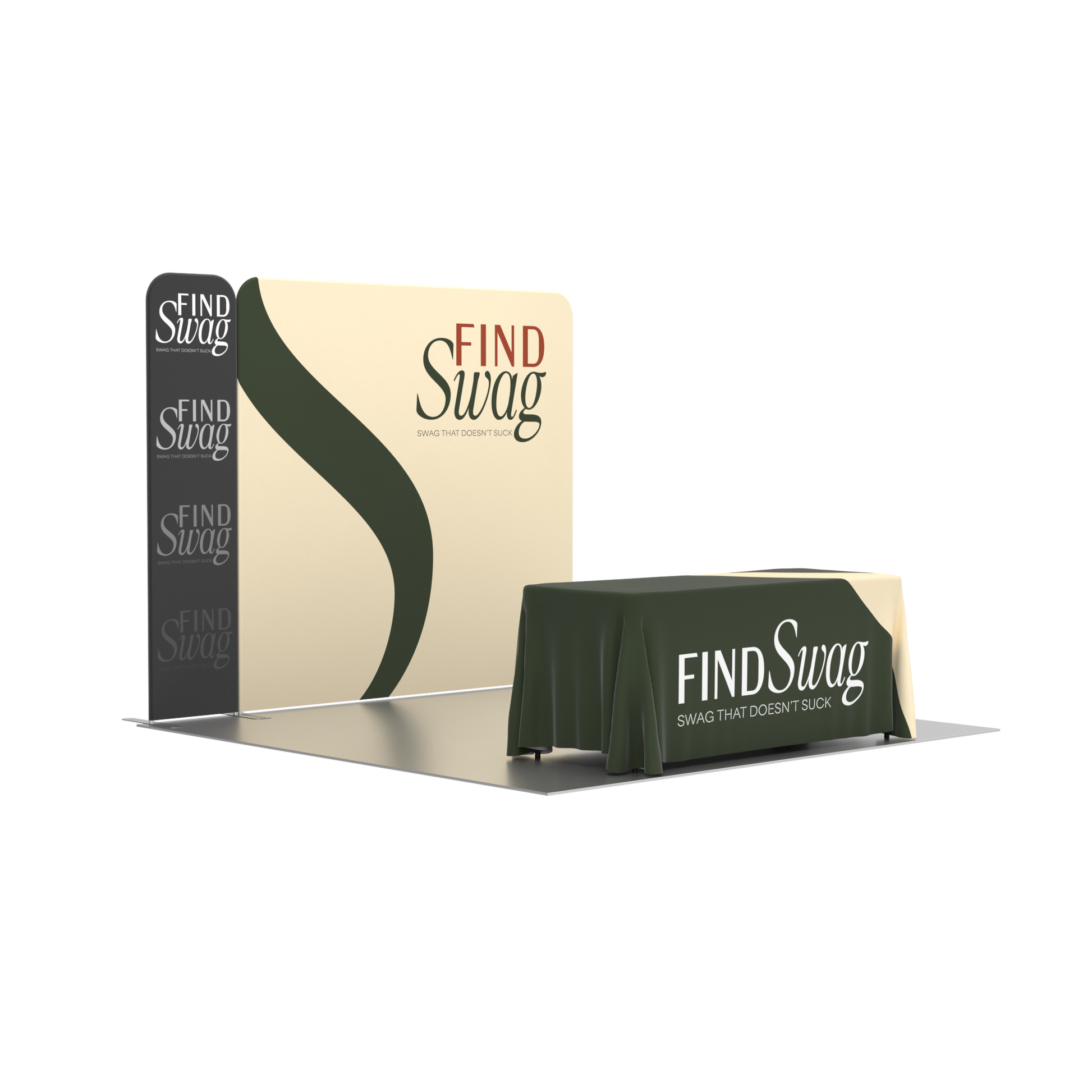 Full Booth Branding – Includes a fabric banner stand, straight tension fabric display, and custom dye-sublimated table throw for a unified, polished display.
